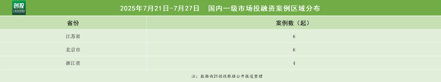 从披露获投企业的地域分布来看,本周的融资地区主要集中在江苏省、北京市和浙江省,分别完成6笔、6笔、4笔融资。