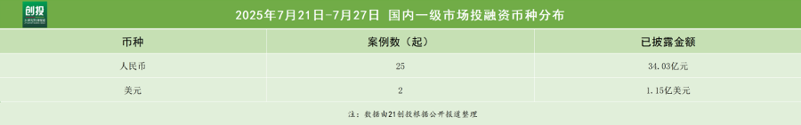 21创投不完全统计,7月21日—7月27日,报告日期内国内一级市场发生融资事件29起。其中,有27笔融资披露了融资金额和币种信息,总规模约合人民币42.31亿元人民币。