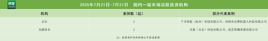 从机构投资活跃度来看,本周京东与光源资本较为活跃,各完成2笔融资,主要聚集在科技与制造领域。